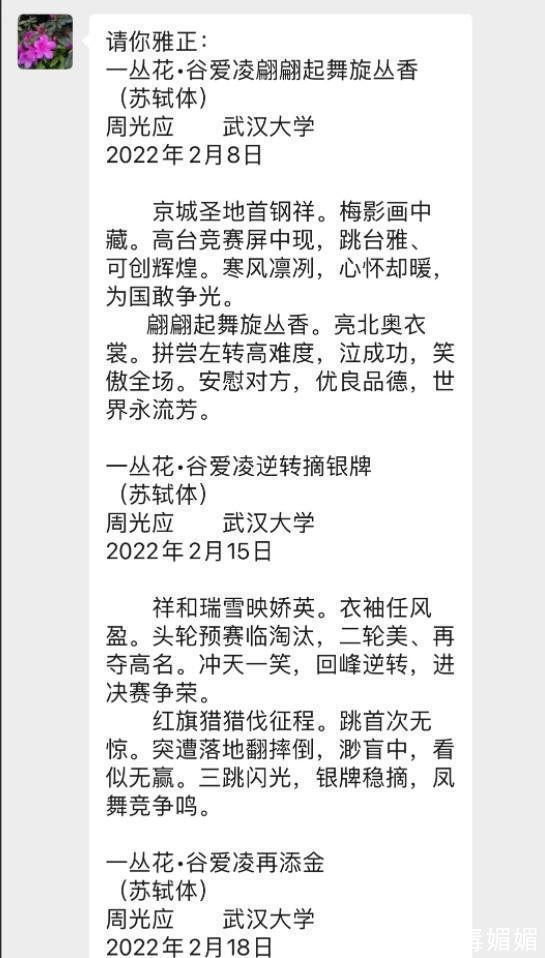 ?武汉大学教授周光应写给谷爱凌的三首词: